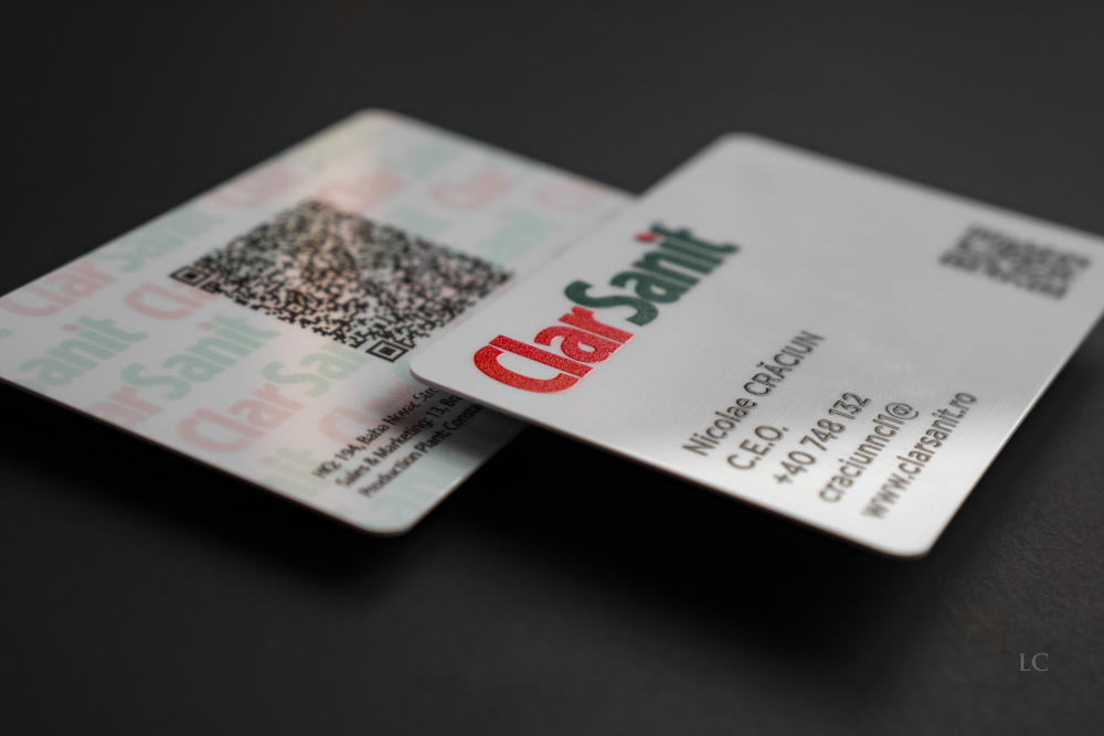 Printed on the same plastic used for bank cards, these business cards can be produced with standard print, raised print, spot UV varnish, and foil stamping.