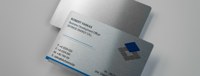 Luxury aluminium business cards with raised UV printing and transparent spot UV varnish on the logo – a premium solution for technical and energy-driven industries.