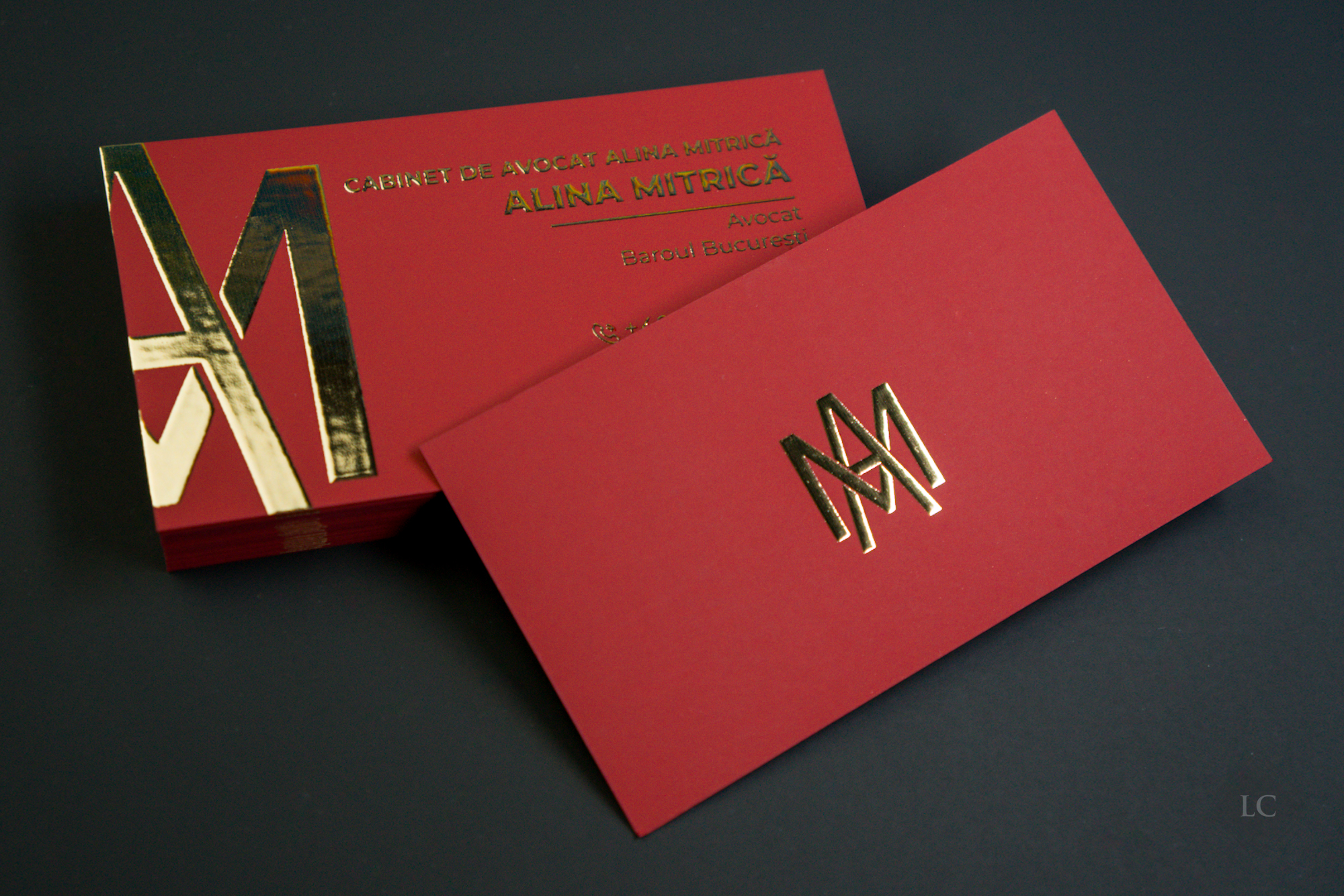 The use of solid-dyed matte cardstock ensures durability and a noble appearance, while the gold foil details capture light in a striking way. The result is a business card that communicates elegance, authority, and impeccable style.