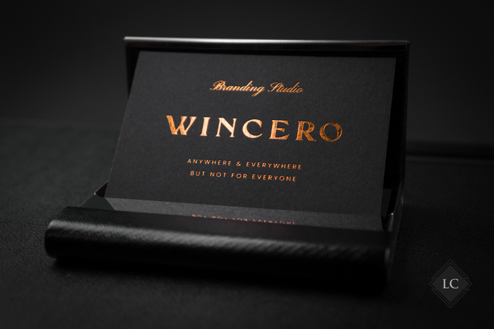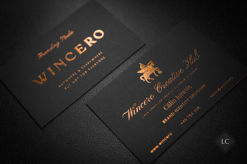 This business card model is produced on premium black matte multilayer cardstock, featuring a subtle and refined texture that offers a pleasant tactile feel and provides the perfect background for metallic details. Copper foil stamping on both sides highlights the text and illustrations through an elegant contrast, creating warm and sophisticated reflections.