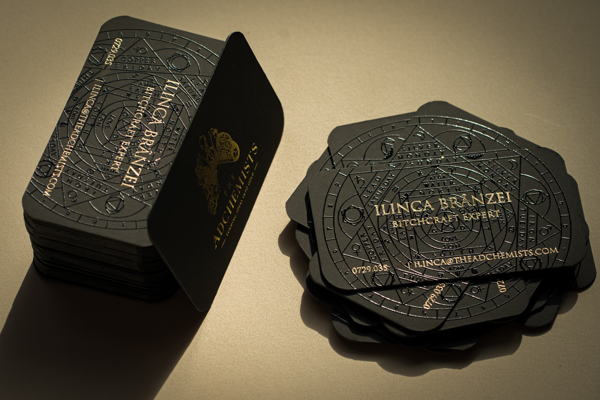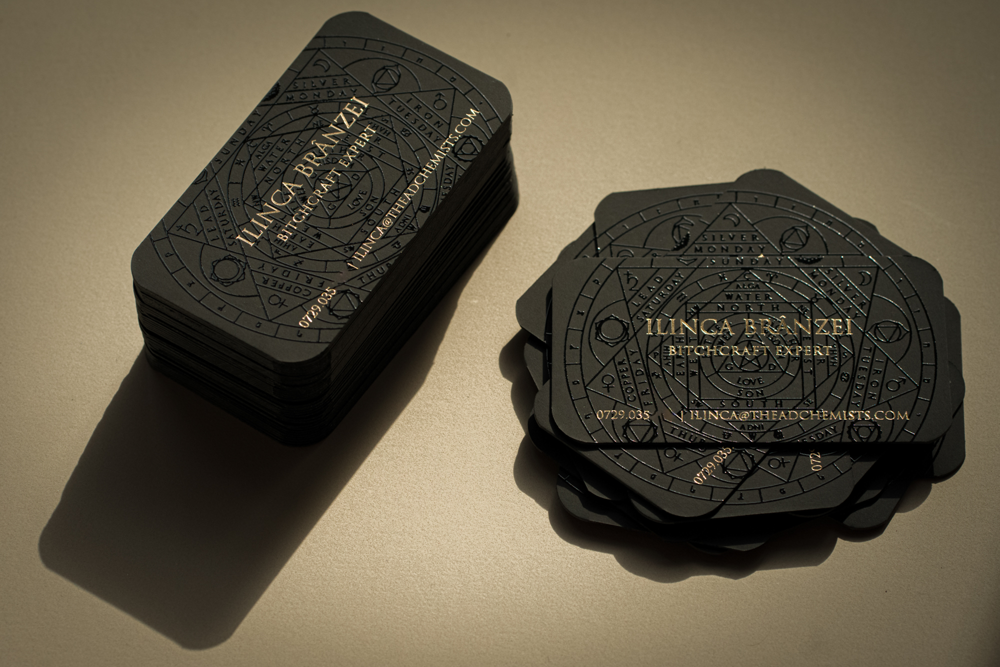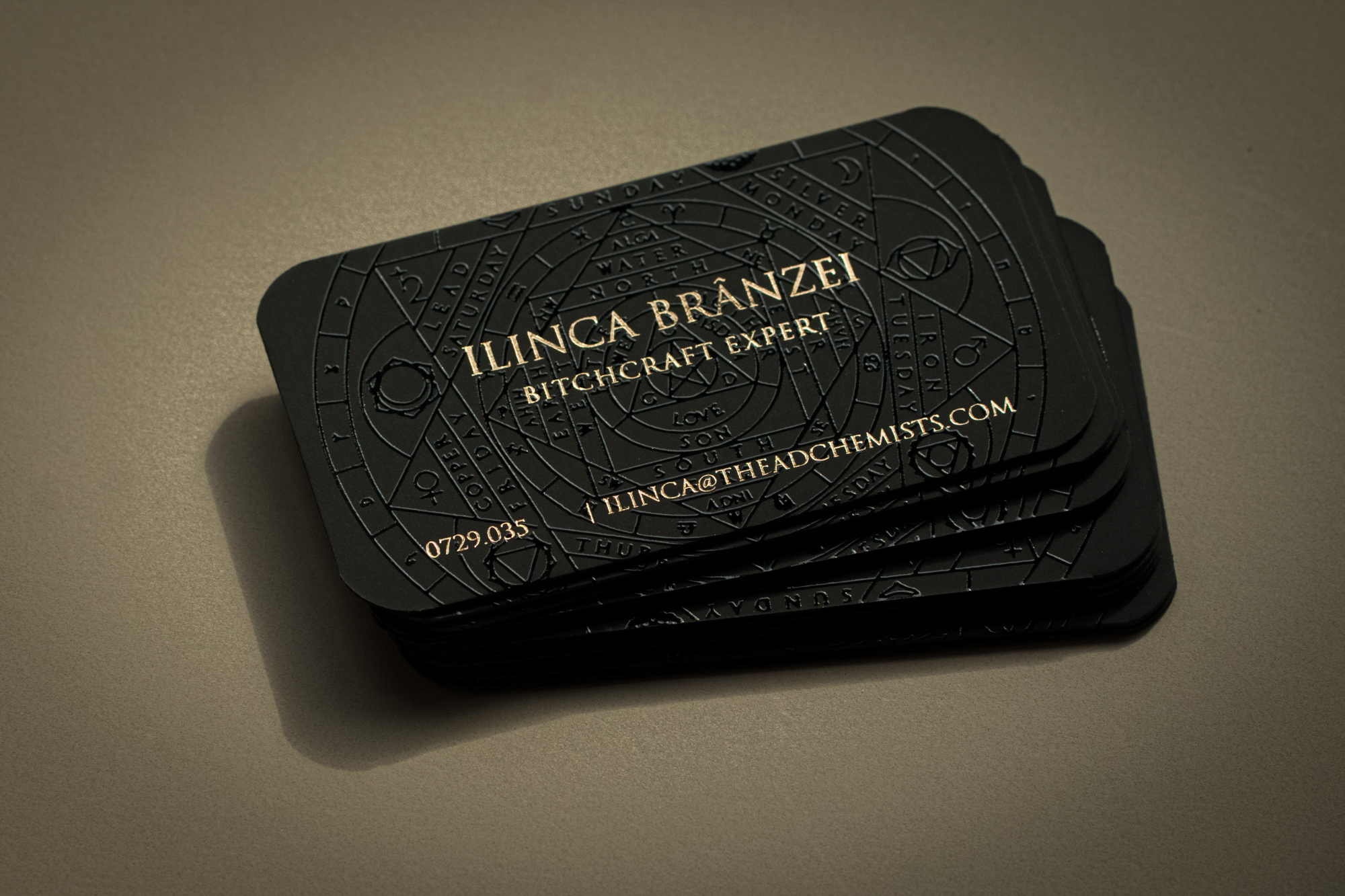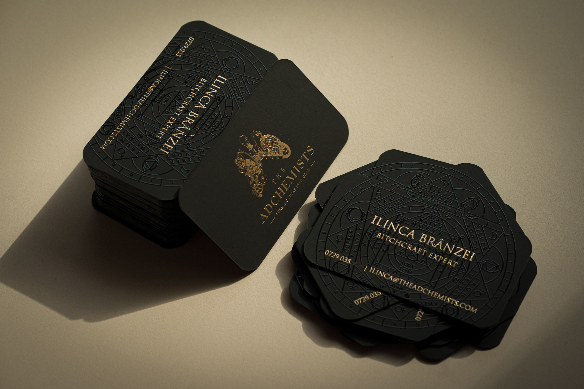 The cards feature gold foil stamping, applied using magnesium dies and hot stamping onto 700 gsm black multilayer cardstock, soft and velvety to the touch, with rounded corners.