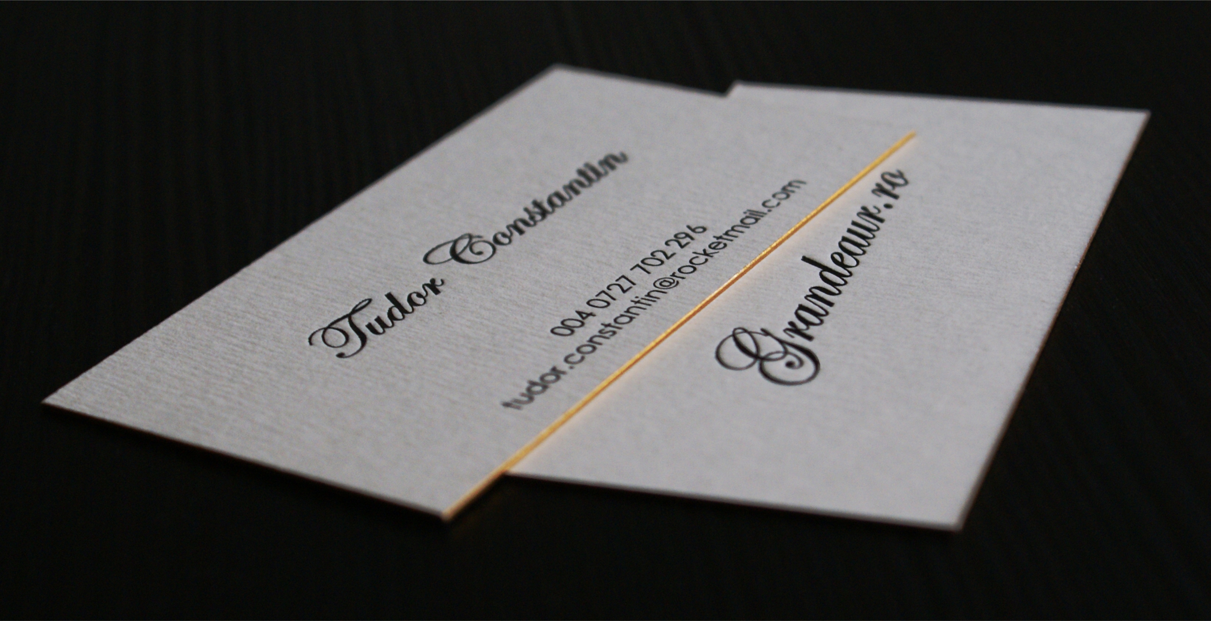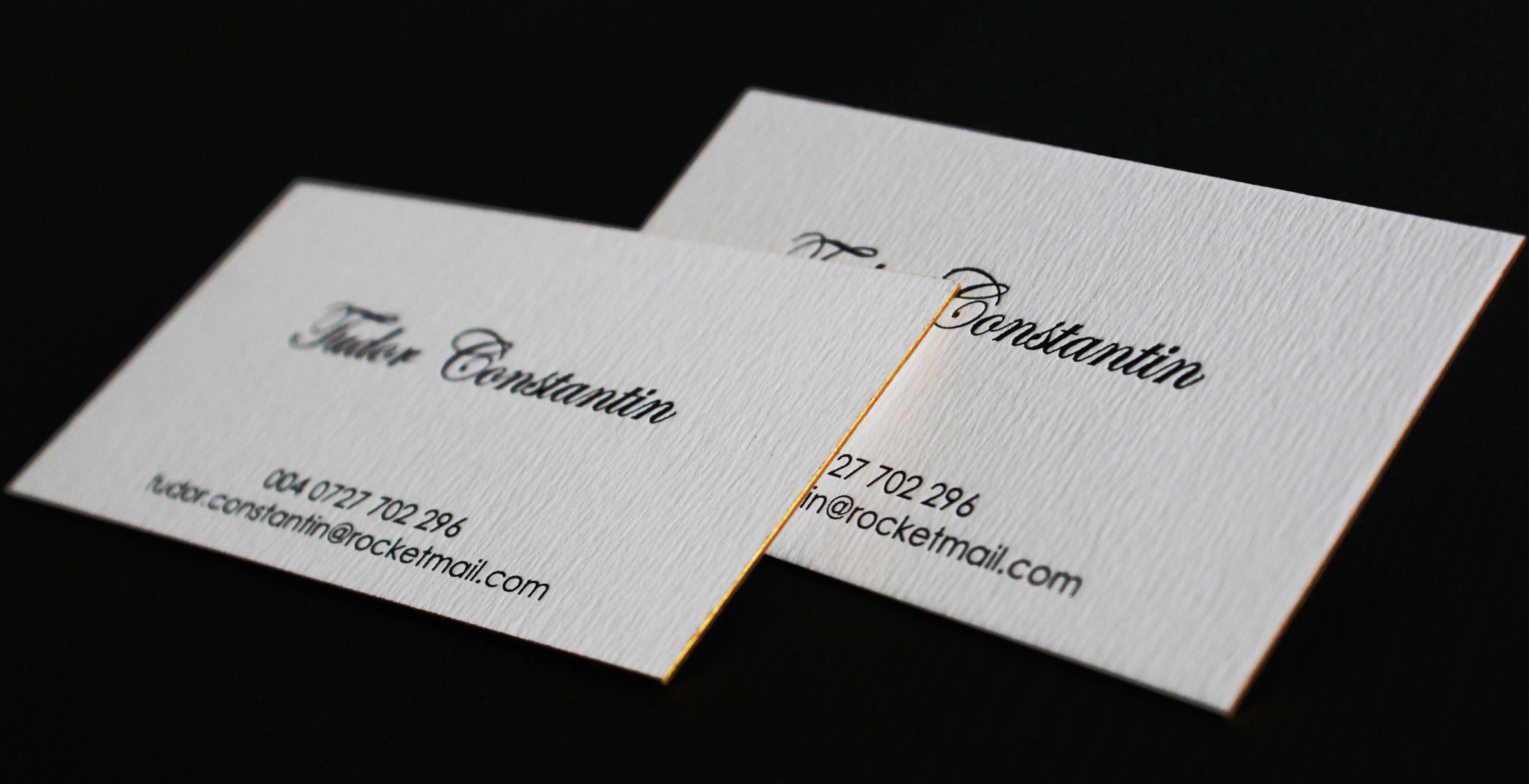 Business cards are no longer just pieces of paper—they require care and refinement. For this project, the client selected textured cardstock, combined with Letterpress, black foil, and gold-painted edges.