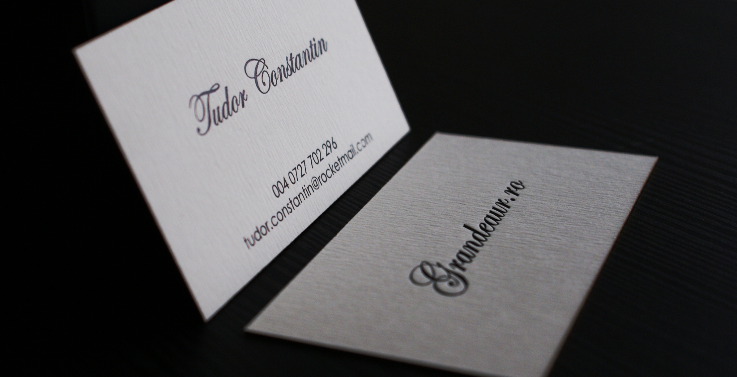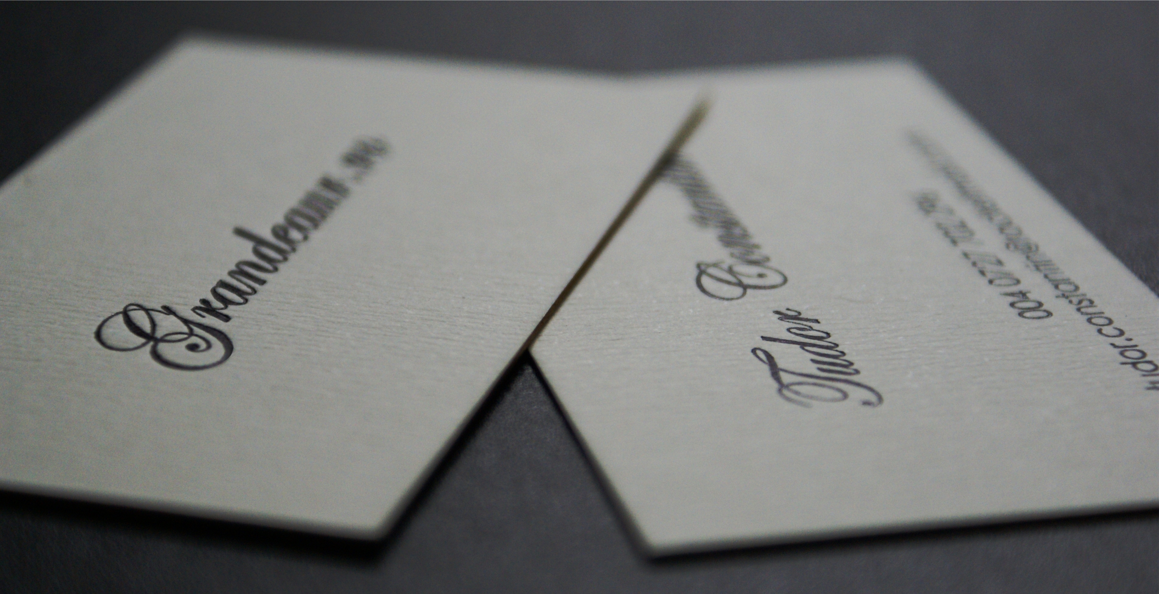 The chosen white paper weighs 450 gsm and features vertical ribbing. After cutting, luxury finishes were applied. Both text and logo were created using Letterpress, applying ink through pressure with a custom die.