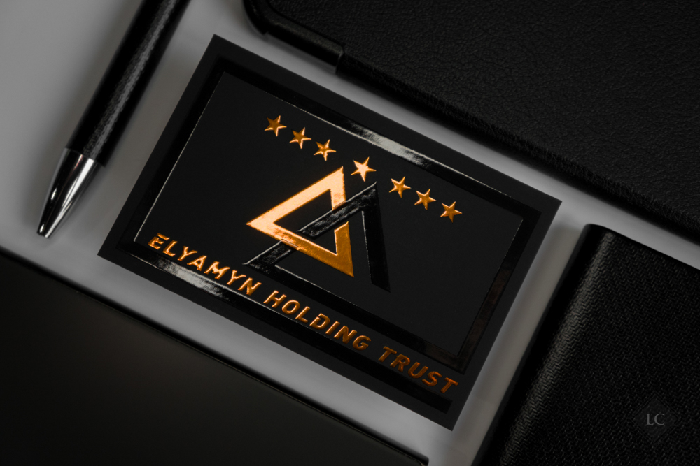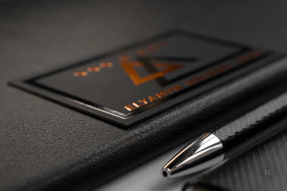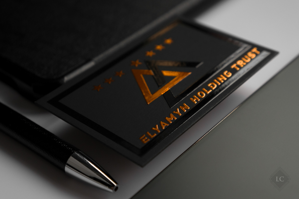 On the front, the company logo is highlighted with raised copper foil, delivering an intense metallic shine and a distinctive tactile sensation. Along the edges, glossy black lines integrated into the logo are produced using transparent gloss spot UV varnish, forming a subtle frame that catches the light in contrast with the matte background.