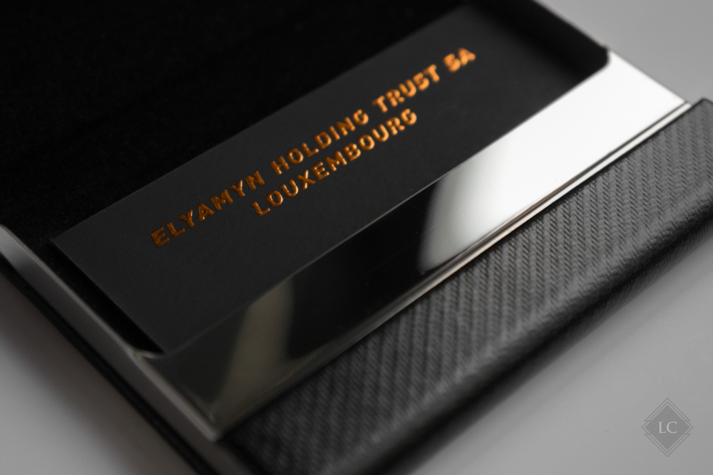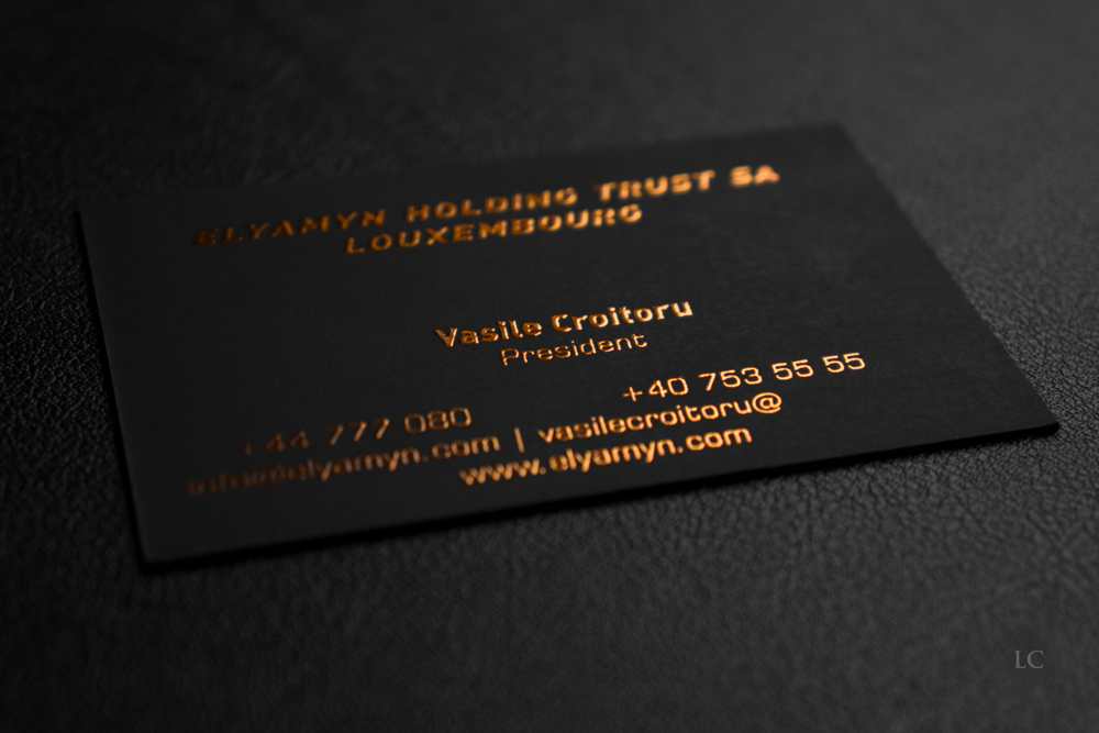 On the back, the contact information is also executed in raised copper foil, ensuring visual consistency. The contrast between the matte surface and the embossed metallic accents creates a sophisticated visual effect, ideal for holding companies, consultancy firms, financial services, and executive-level brands where attention to detail and impeccable image are essential.
