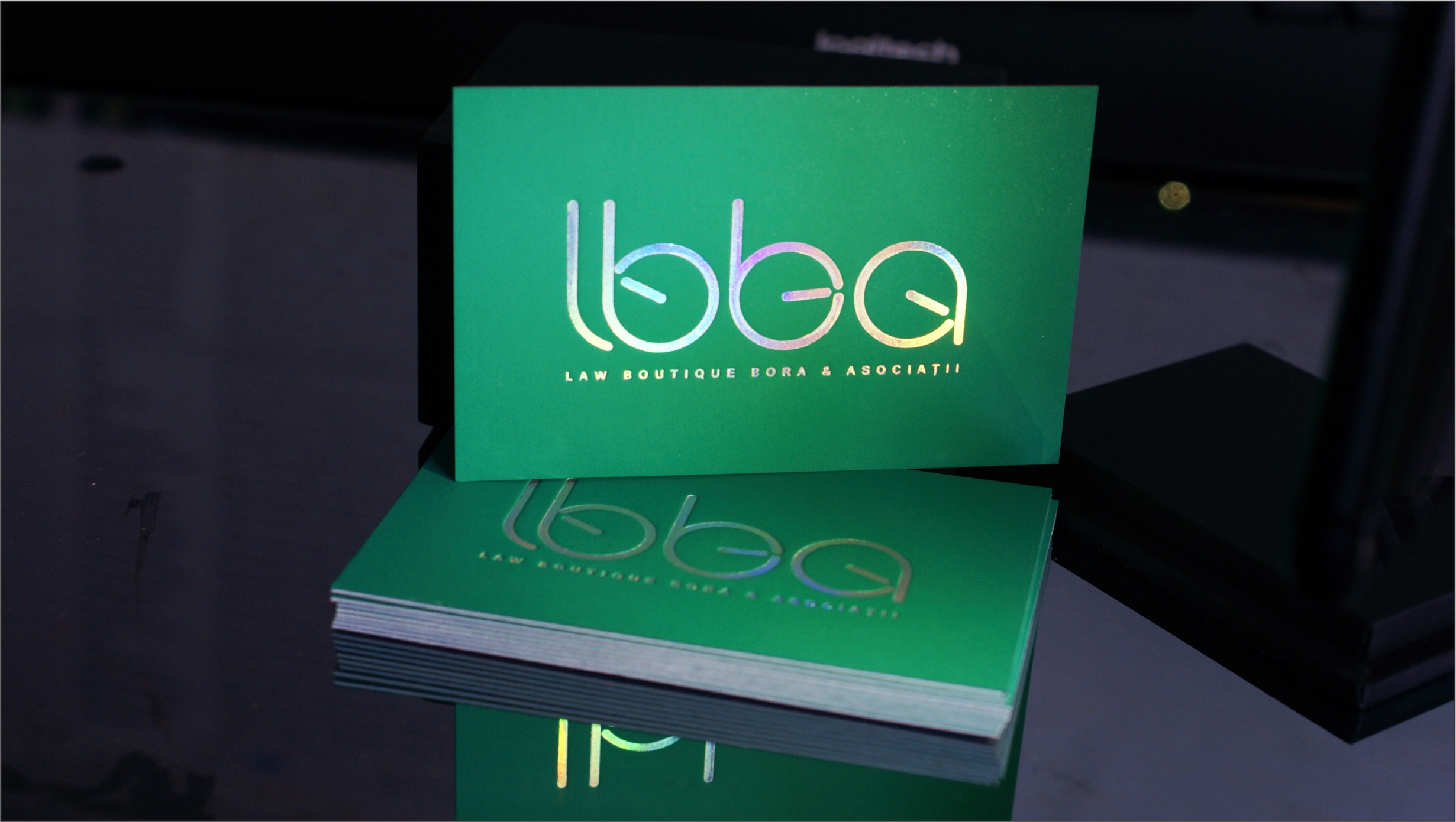 A very interesting new set of business cards, produced on white soft-touch and emerald green multilayer cardstock, finished with holographic foil.