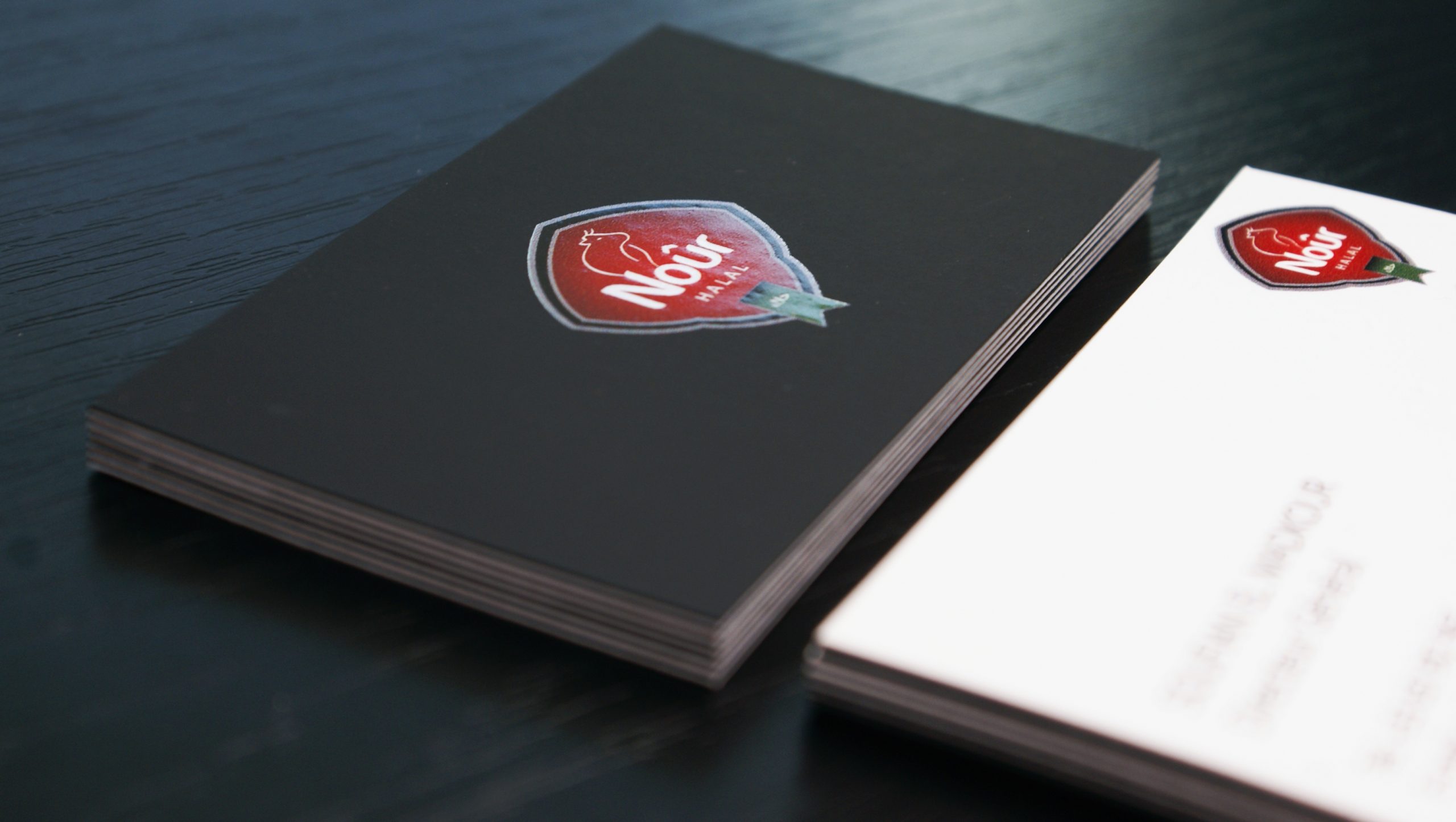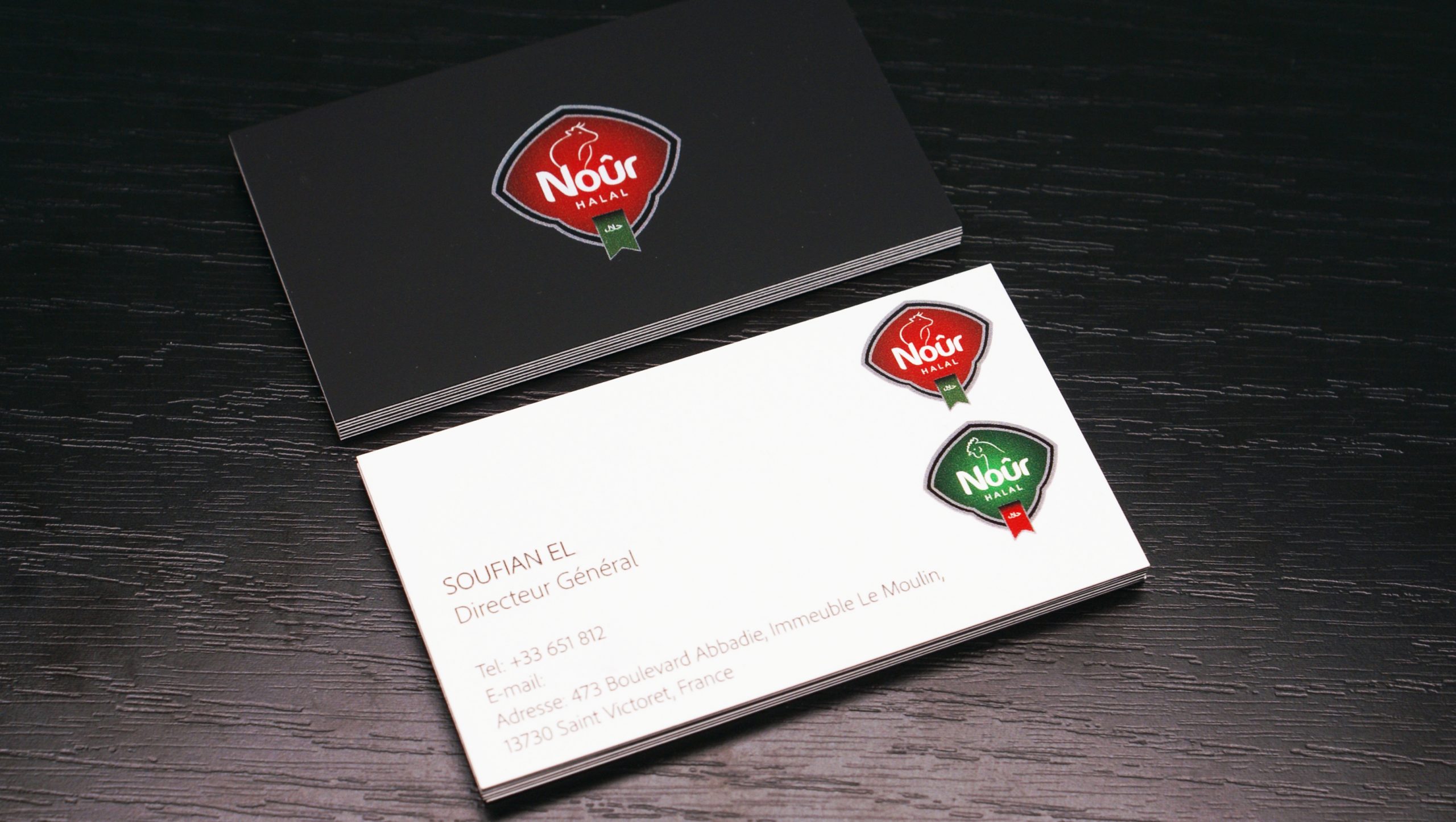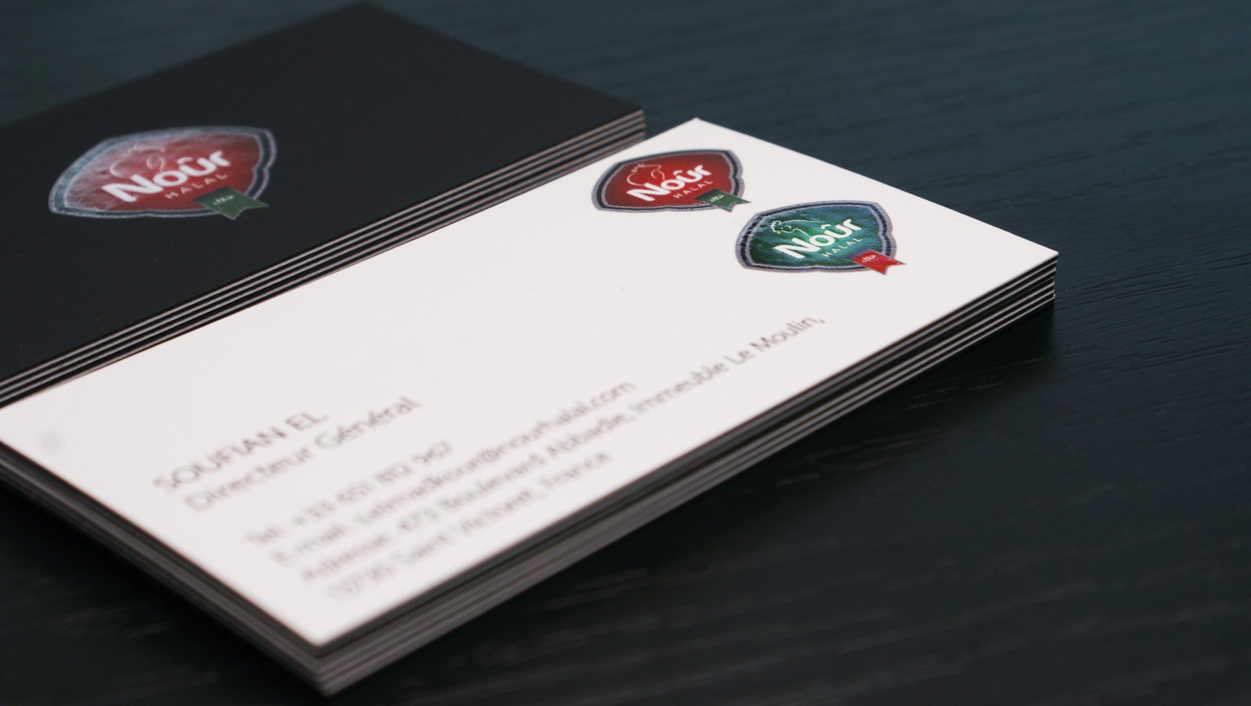 Produced on a white soft-touch multilayer cardstock with a solid-dyed black layer, these business cards required special attention when it came to the graphic layout.