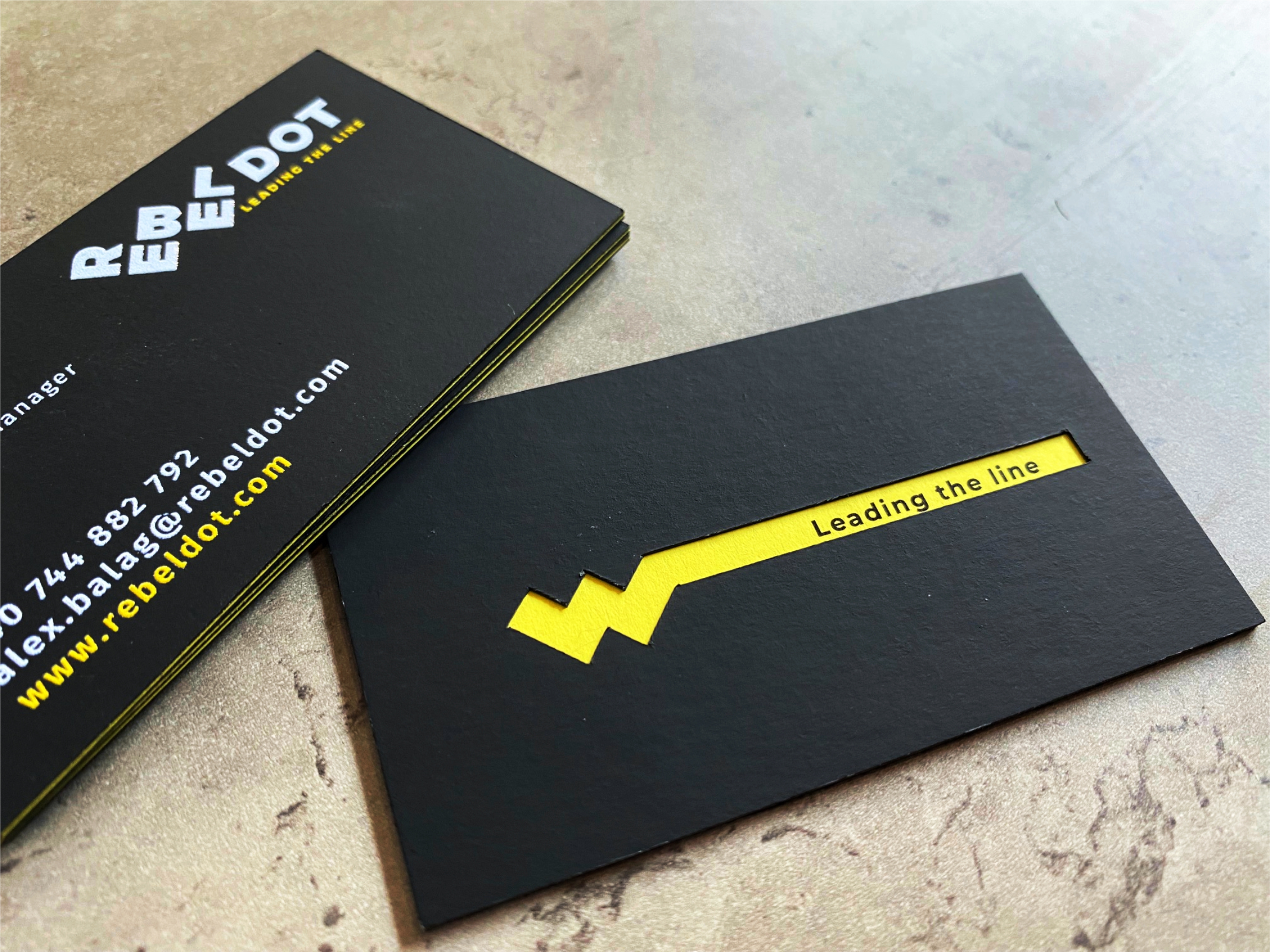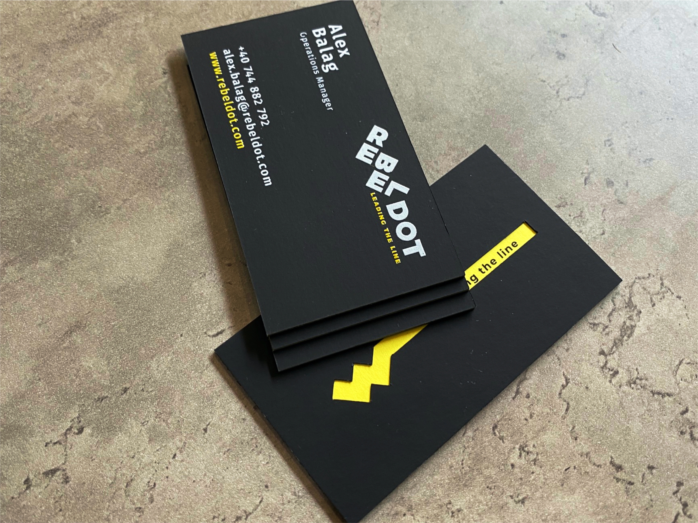 The cards were produced using a three-layer construction: black – yellow – black. The most challenging step was aligning the laser-cut black layer with the digitally printed yellow core before bonding.