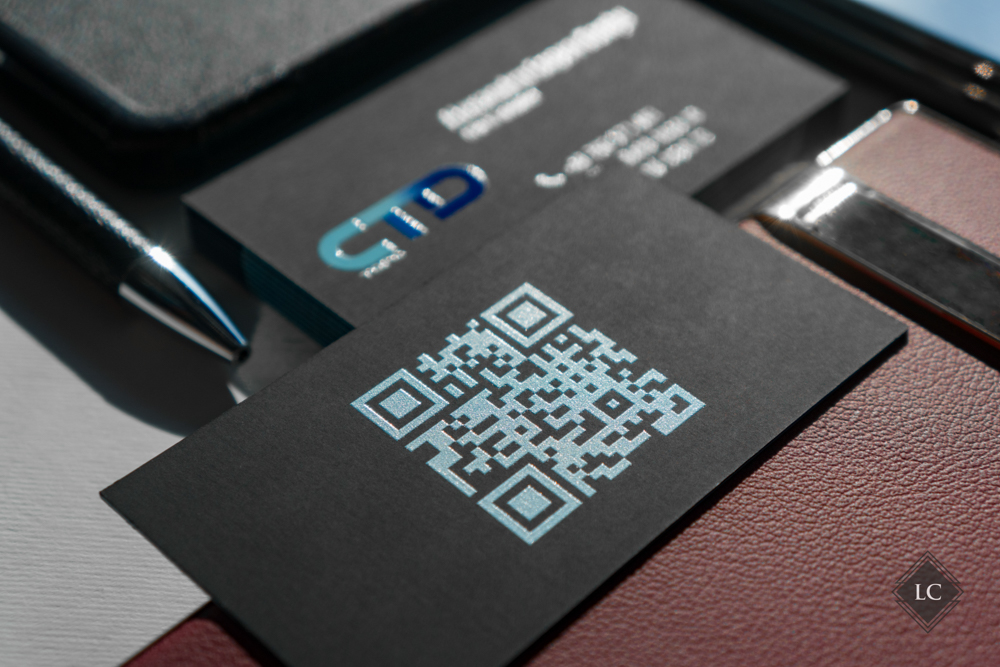 This business card model is designed to deliver both visual and tactile impact from the very first interaction. The product represents a premium business card, crafted from triple-layered cardstock with a visible coloured core and finished with raised UV printing and gloss spot UV varnish.