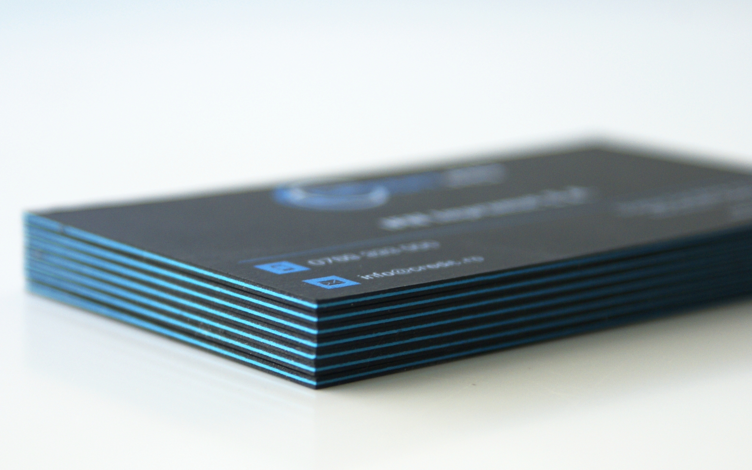 Printed on triplex cardstock, with black, blue, and black layers chosen to match the client’s branding. The combined thickness reaches 1000 gsm, slightly thicker than a standard bank card.