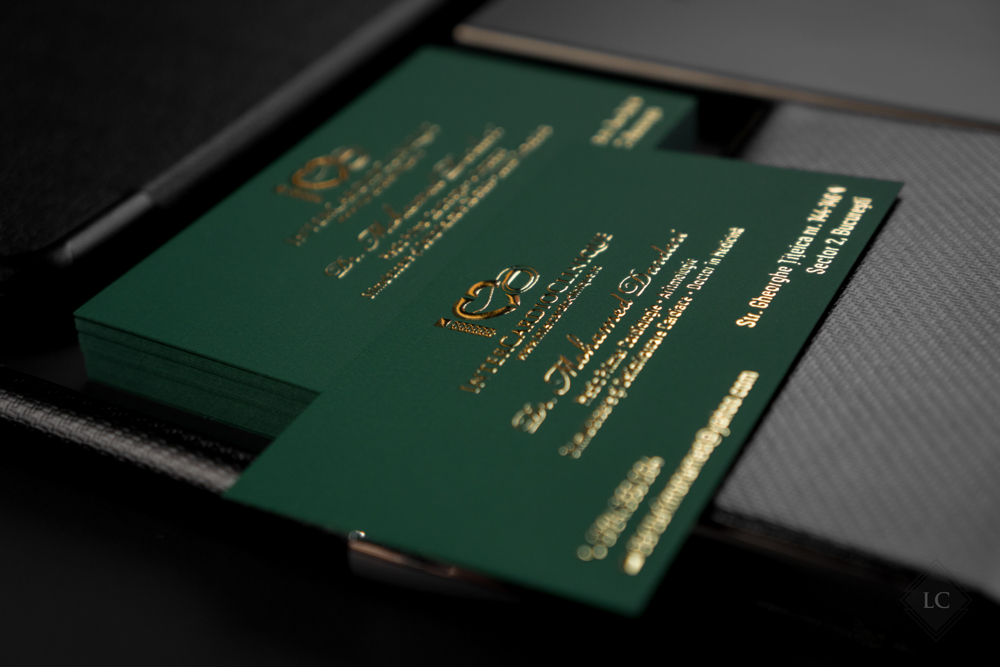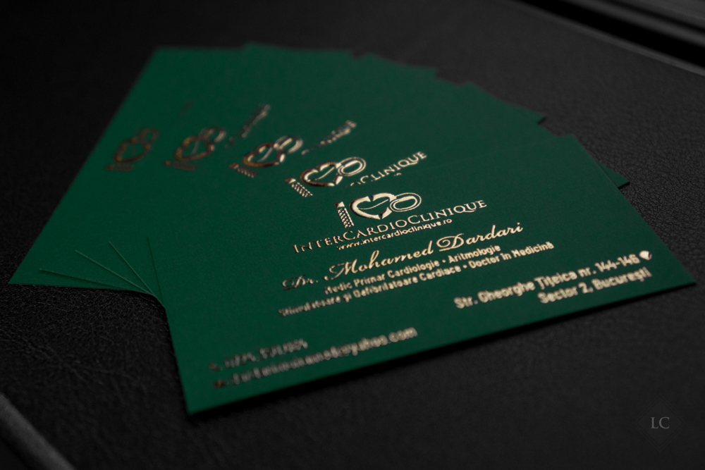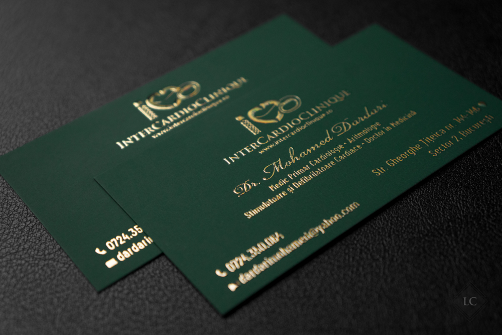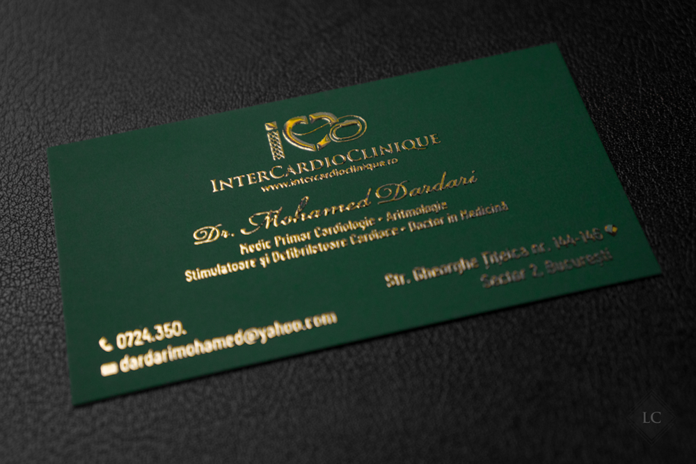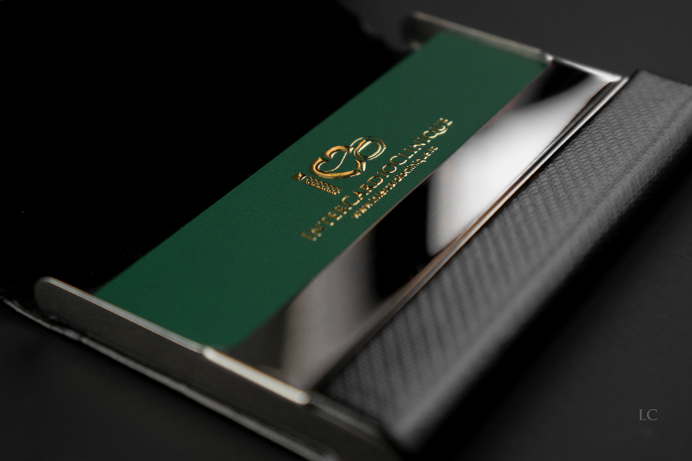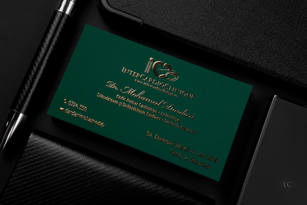 All information — the clinic logo, doctor’s name, specializations, and contact details — is executed using raised gold foil, adding a luxurious effect perfectly suited to a field where trust and prestige are essential. The heart symbol is seamlessly integrated into the design, aligning naturally with the cardiologist’s profession and reinforcing the personal brand identity.