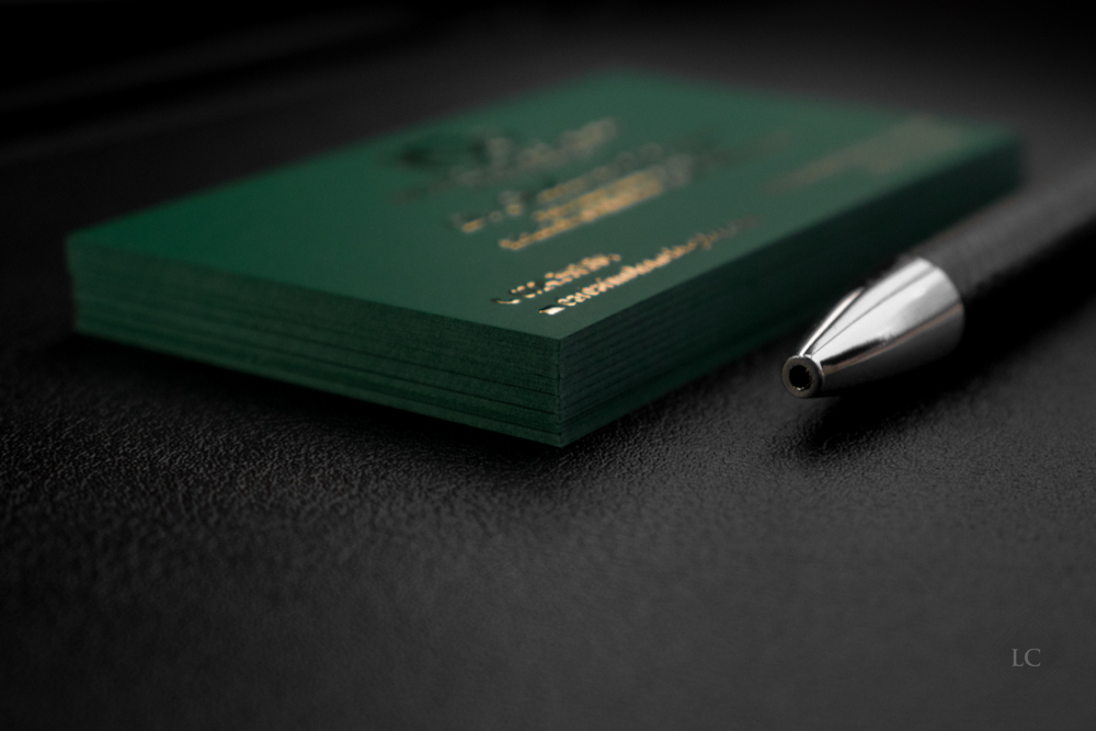 This business card model impresses with a classic appearance defined by the emerald green board, featuring a matte texture that enhances every graphic element. The subtly velvety surface creates visual contrast with the metallic details and adds a premium, professional feel.