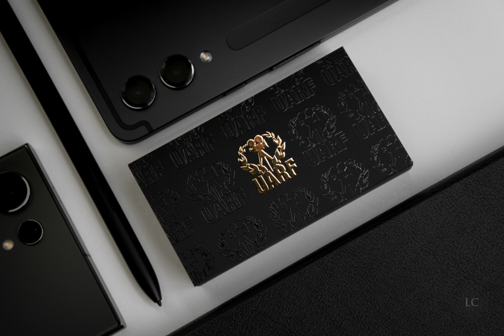The back continues the premium aesthetic, featuring a central logo executed in raised gold foil. The background is covered with a subtle pattern formed from the logo outlines, applied using raised transparent gloss spot UV varnish. The interplay between matte, gloss, and metallic finishes creates a sophisticated sense of depth and light.