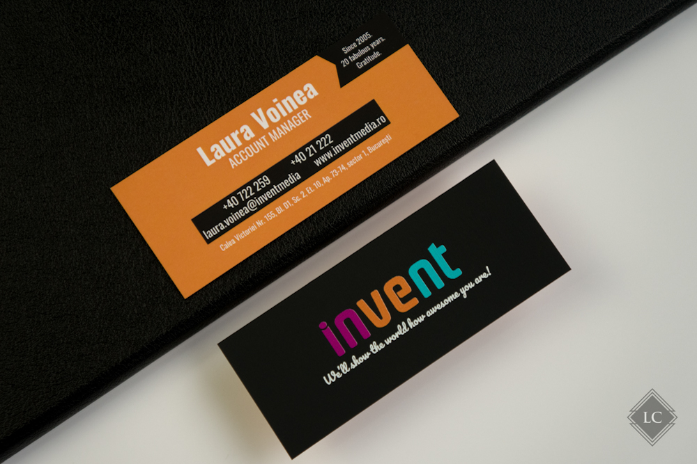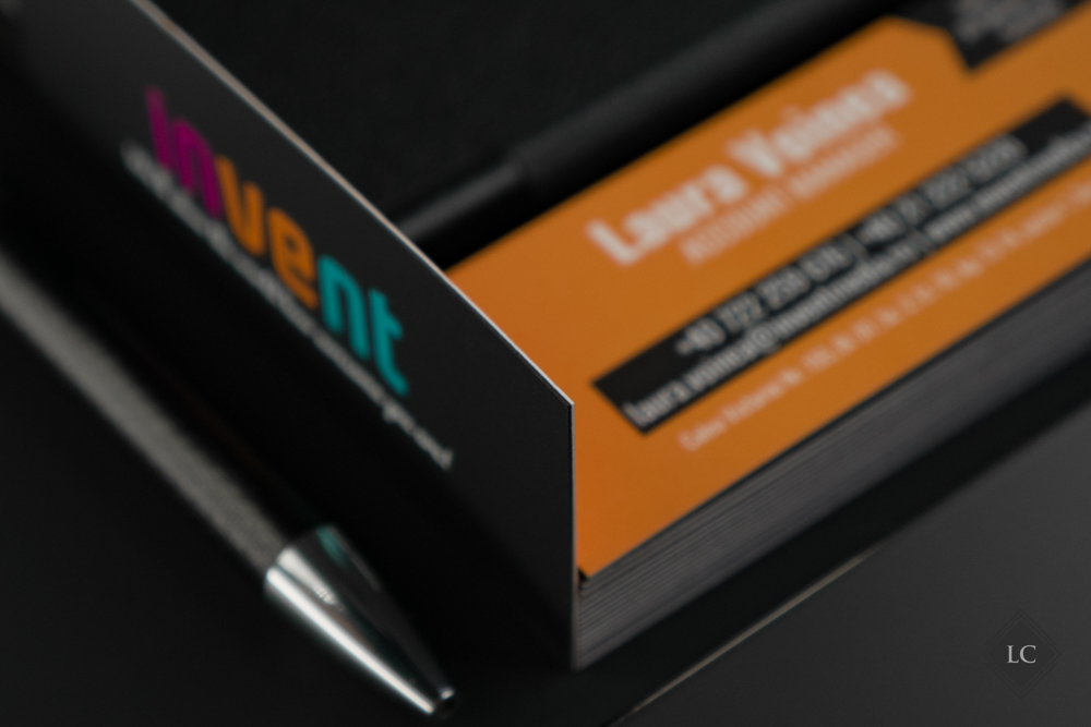 The orange front is finished with soft-touch lamination, providing a velvety tactile feel along with increased durability. The dynamic layout, featuring black sections that create a visual cut-out effect, combined with the strong contrast between black, white, and orange, conveys energy and professionalism – making these business cards ideal for creative industries, media agencies, event organizers, or promoters.