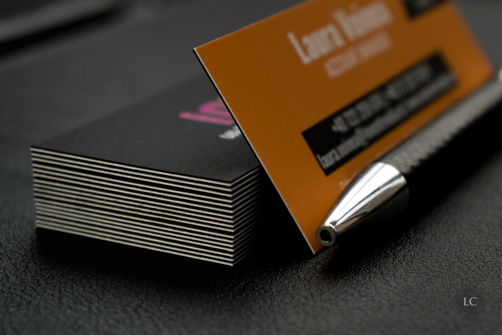 These business cards stand out through their multi-layer construction, created by bonding two separate layers: a white layer used as the digital printing base for the orange front, and a matte black layer dedicated to the premium back side.