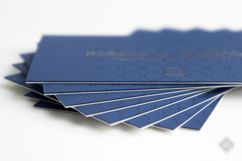 These business cards represent a refined example of modern elegance, built through the careful combination of premium materials and high-precision finishing techniques. The structure is based on multi-layer cardstock — two bonded sheets, one white and one blue — adding rigidity, thickness, and a luxurious feel from the first touch.