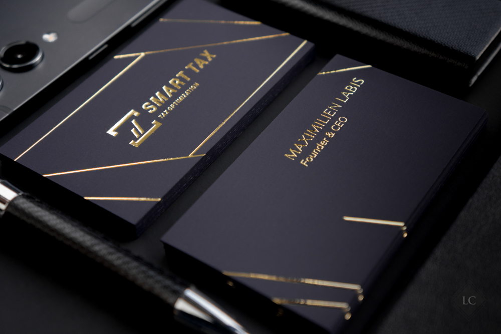 On the front, the logo and company name—together with a minimalist geometric pattern—are executed entirely in raised gold foil. The strong contrast between the matte navy surface and the golden metallic reflections creates a luxurious, modern, and highly memorable visual effect.